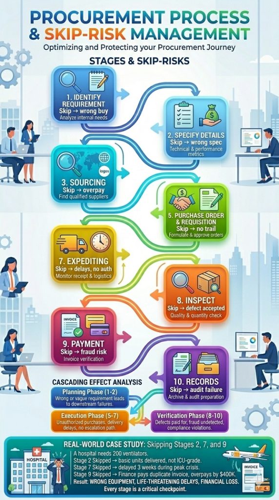 A hospital urgently needed 200 ventilators. Under pressure, the procurement team skipped three stages. They skipped Stage 2, so no specifications were written. The vendor delivered basic units, not the ICU-grade models the clinical team actually needed. They skipped Stage 7, so nobody followed up on the delivery timeline. The equipment arrived three weeks late during the peak of the crisis it was meant to address. And they skipped Stage 9, so payment controls were bypassed. A duplicate invoice went through, and the hospital overpaid by $400,000.